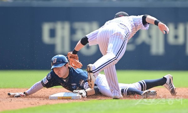19일 서울 잠실야구장에서 ‘2021 신한은행 SOL KBO리그’ LG 트윈스와 NC 다이노스의 경기가 열렸다. 3회초 1사 1루 상황에서 NC 1루주자 박민우가 2루로 도루를 시도했지만 LG 유격수에게 태그 아웃되고 있다.