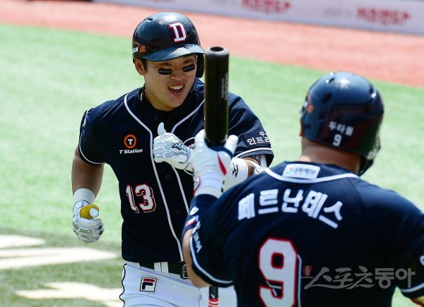 19일 경기도 수원 kt위즈파크에서 ‘2021 신한은행 SOL KBO리그’ kt 위즈와 두산 베어스의 경기가 열렸다. 1회초 무사에서 두산 허경민이 솔로 홈런을 쏘아 올린 뒤 동료와 기쁨을 나누고 있다.
