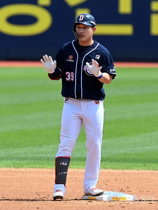 19일 경기도 수원 kt위즈파크에서 ‘2021 신한은행 SOL KBO리그’ kt 위즈와 두산 베어스의 경기가 열렸다. 1회초 2사 1, 2루에서 두산 김인태가 2타점 2루타를 날린 뒤 환호하고 있다.