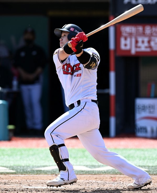 19일 경기도 수원 kt위즈파크에서 ‘2021 신한은행 SOL KBO리그’ kt 위즈와 두산 베어스의 경기가 열렸다. 4회말 1사에서 kt 이홍구가 솔로 홈런을 쏘아 올리고 있다.