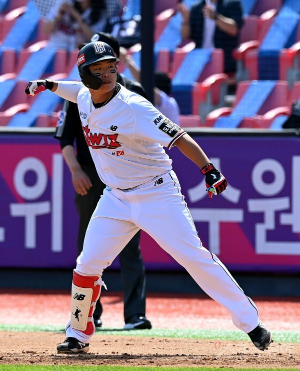 19일 경기도 수원 kt위즈파크에서 ‘2021 신한은행 SOL KBO리그’ kt 위즈와 두산 베어스의 경기가 열렸다. 3회말 무사 2, 3루에서 kt 강백호가 2타점 적타를 날린 뒤 세리머니를 펼치고 있다.