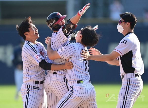 연장 10회말 2사 만루 LG 홍창기가 끝내기 역전 안타를 쳐낸 뒤 동료들과 기쁨을 나누고 있다.