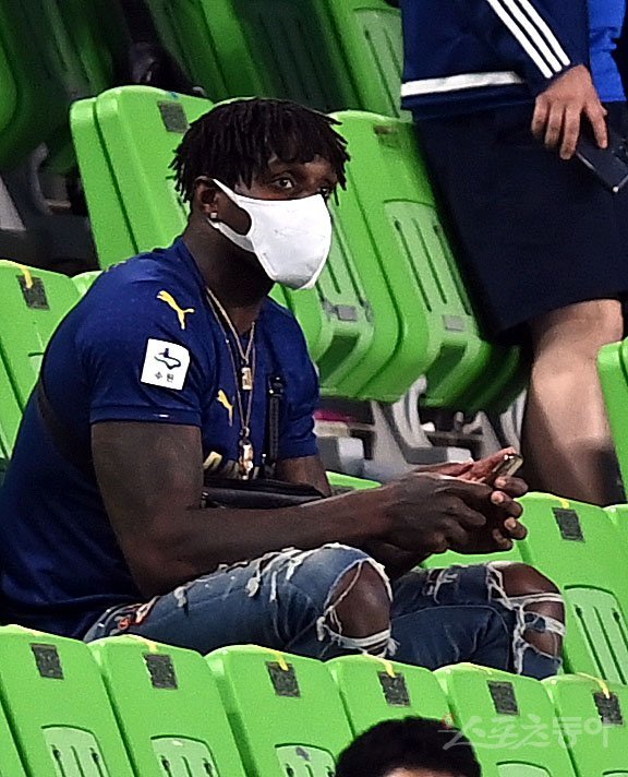 19일 경기도 수원월드컵경기장에서 열린 ‘하나원큐 K리그1 2021’ 수원 삼성과 대구FC의 경기에서 프로농구 KCC 라건아가 축구 경기를 지켜보고 있다.