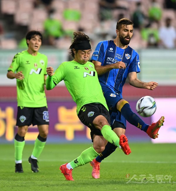19일 전주월드컵경기장에서 열린 프로축구 ‘하나원큐 K리그1 2021’ 전북현대와 울산현대 경기에서 전북 최보경과 울산 힌터제어가 볼다툼을 하고 있다.