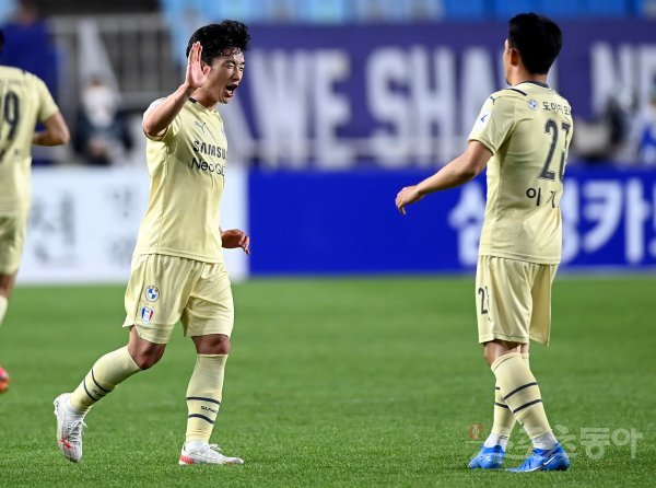 19일 경기도 수원월드컵경기장에서 열린 ‘하나원큐 K리그1 2021’ 수원 삼성과 대구FC의 경기에서 수원 김민우가 대구 골키퍼를 속이며 페널티킥을 넣은 뒤 환호하고 있다.