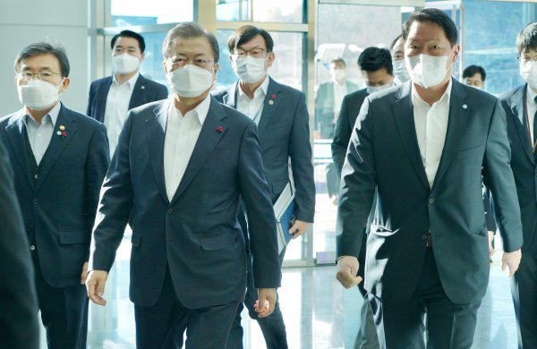 문재인 대통령이 최태원 SK회장과 함께 20일 오전 경북 안동시 SK바이오사이언스 공장을 방문하고 있다. SK바이오사이언스 공장에서는 국민들의 코로나19 예방 접종을 위해 공급될 아스트라제네카 백신을 위탁생산하고 있다. 사진 | 뉴시스