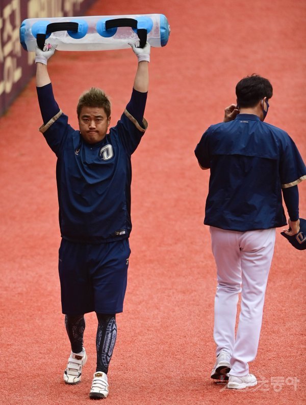 20일 서울 잠실야구장에서 ‘2021 신한은행 SOL KBO리그’ LG 트윈스와 NC 다이노스의 경기가 열린다. 경기에 앞서 NC 박석민이 물통을 들어올리고 있다.