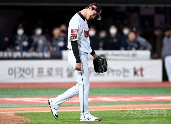 2회초 두산에 6실점을 허용한 kt 선발 고영표가 고개를 숙이고 있다.