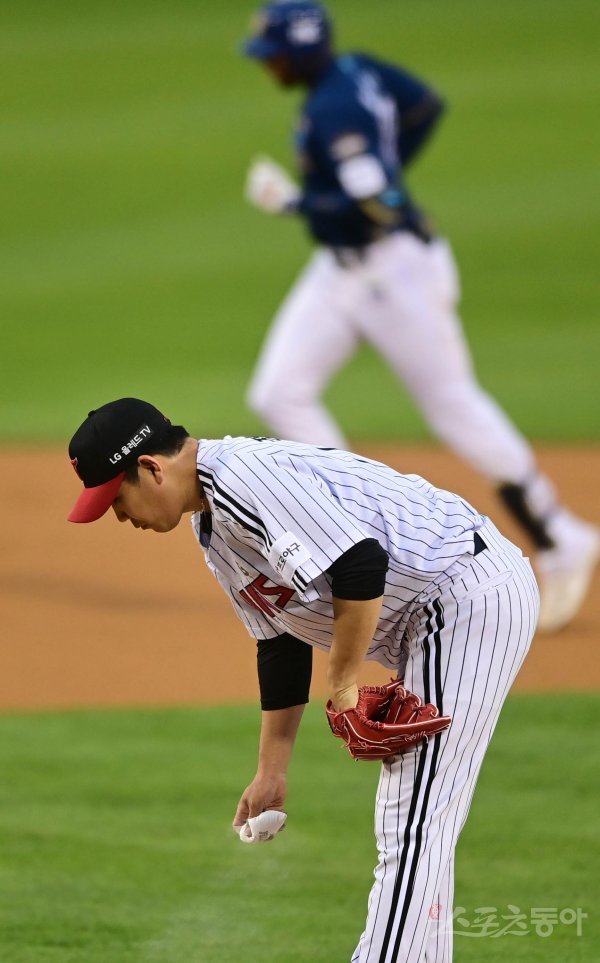 1회초 2사 NC의 백투백 홈런 때 LG 정찬헌이 아쉬워하고 있다.