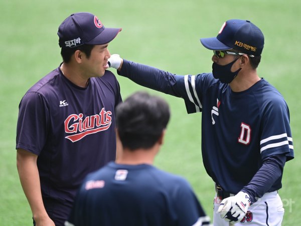 23일 서울 잠실야구장에서 ‘2021 신한은행 SOL KBO리그’ 두산 베어스와 롯데 자이언츠의 경기가 열린다. 경기에 앞서 롯데 전준우와 두산 공필성 코치가 인사를 하고 있다.