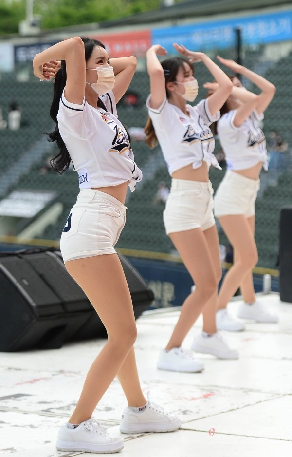 23일 서울 잠실야구장에서 ‘2021 신한은행 SOL KBO리그’ 두산 베어스와 롯데 자이언츠의 경기가 열렸다. 두산 치어리더들이 응원 단상에서 공연을 펼치고 있다.