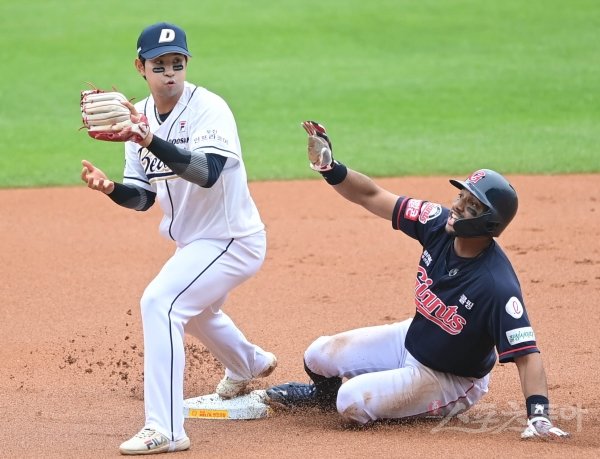 23일 서울 잠실야구장에서 ‘2021 신한은행 SOL KBO리그’ 두산 베어스와 롯데 자이언츠의 경기가 열렸다. 1회초 1사 1루 롯데의 내야 땅볼 때 두산 2루수 강승호가 1루주자 마차도를 포스 아웃시키고 있다.