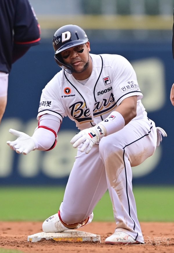23일 서울 잠실야구장에서 ‘2021 신한은행 SOL KBO리그’ 두산 베어스와 롯데 자이언츠의 경기가 열렸다. 4회말 1사 두산 페르난데스가 우전 2루타를 쳐낸 뒤 세리머니를 하고 있다.