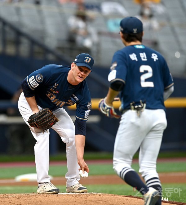 선발 투수로 등판한 NC 루친스키가 2회말 투구를 마치고 박민우에게 로진백을 던지며 장난을 치고 있다.