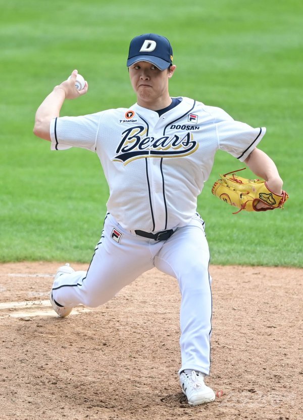 7회초 두산 박치국이 마운드에 올라 역투하고 있다.