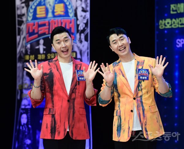 가수 상호, 상민 형제가 24일 서울 강남구 일지아트홀에서 열린 ‘트롯 전국체전’ 전국투어 콘서트 제작발표회에서 포즈를 취하고 있다.