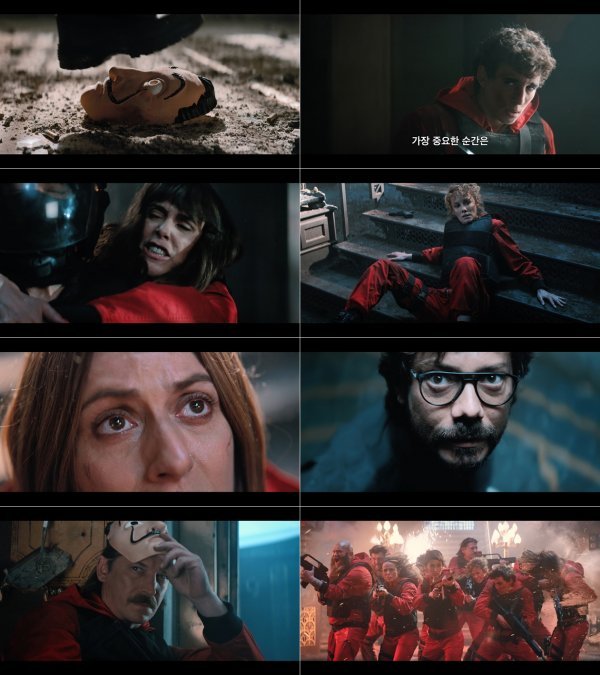 공개된 영상은 “가장 중요한 순간은 돌이킬 수 없음을 깨달았을 때다”라고 말하는 도쿄의 독백으로 시작한다. 도쿄는 강도단의 상징과도 같은 마스크를 밟고 걸음을 옮기고 전쟁터와 같은 아비규환 속에서 이들이 어떤 끝을 맞이할지 호기심을 자극한다. ‘종이의 집’ 파트5는 스페인 국립은행에 보관된 95톤의 금을 훔치기 위한 강도단의 마지막 이야기를 그린다. 경찰에 붙잡혔던 리스본을 가까스로 구출했지만 이들은 이미 동료 한 명을 잃은 데다가 교수도 시에라 경감에게 붙잡히게 되면서 또 다른 위기를 맞이한다. 설상가상 군대가 출동하면서 최악의 상황을 마주하게 된다. 총괄 제작자 알렉스 피나는 “팬데믹 와중에 파트5를 쓰기 시작하면서, 기존의 10개 에피소드로 구성된 시즌을 만드는 방법을 완전히 탈피해야 한다는 생각이 들었다. 시리즈의 장대한 피날레가 보여줘야 할 느낌은 1부 안에 담아내기 위해 모든 방법을 총동원했다. 강도단을 궁지로 몰아넣으면서 굉장히 공격적으로 장르성을 담아냈다. 2부에서는 캐릭터의 감정에 더 주목했다. 캐릭터들과 감정적 여정을 함께함으로써, 그들과의 이별을 더욱 실감하게 될 것이다”고 덧붙여 궁금증을 끌어올렸다.