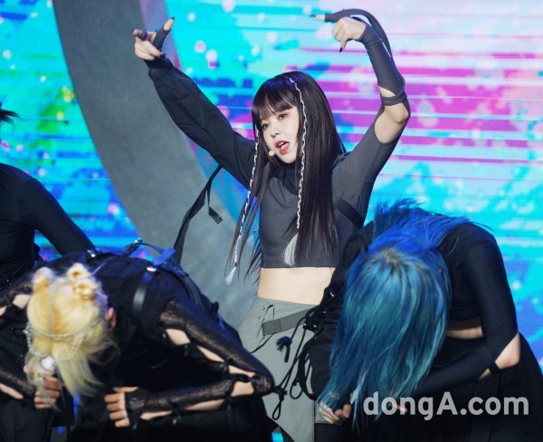 그룹 에버글로우의 이유가 25일 오후 세 번재 싱글 앨범 \'라스트 멜로디\' 발매 온라인 쇼케이스에서 새로운 무대를 선보이고 있다.