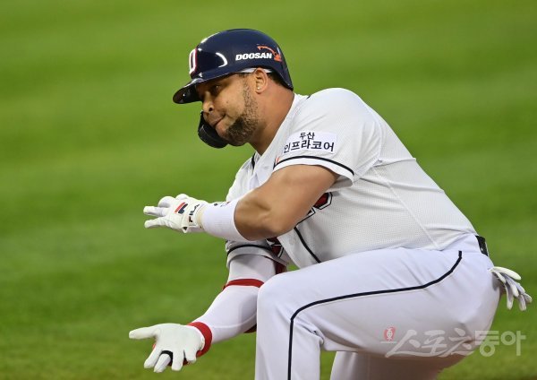 3회말 2사 2루 두산 페르난데스가 선제 1타점 좌전 적시타를 쳐낸 뒤 더그아웃을 향해 세리머니를 하고 있다.