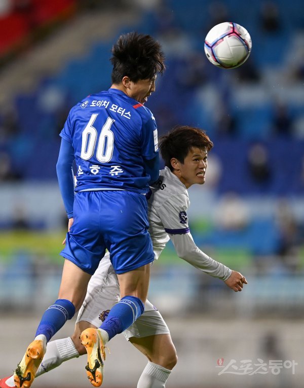 26일 수원월드컵경기장에서 열린 ‘2021 하나은행 FA컵’ 16강전 수원 삼성과 FC안양 경기에서 수원 손호준이 헤딩슛을 하고 있다.