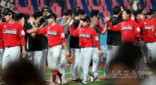 12회 연장 끝에 SSG가 kt에 9-5로 승리한 뒤 선수들이 기쁨을 나누고 있다.