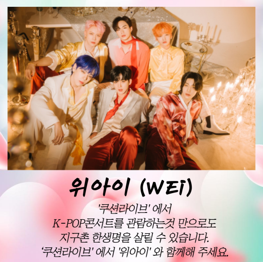 또한 영상 멘트를 통해 “‘케이팝 콘서트를 관람하는것만으로도 지구촌 한생명을 살릴수 있습니다. ‘쿠션 라이브’에서 ‘위아이’와 함께 해주세요”라고 전했다.