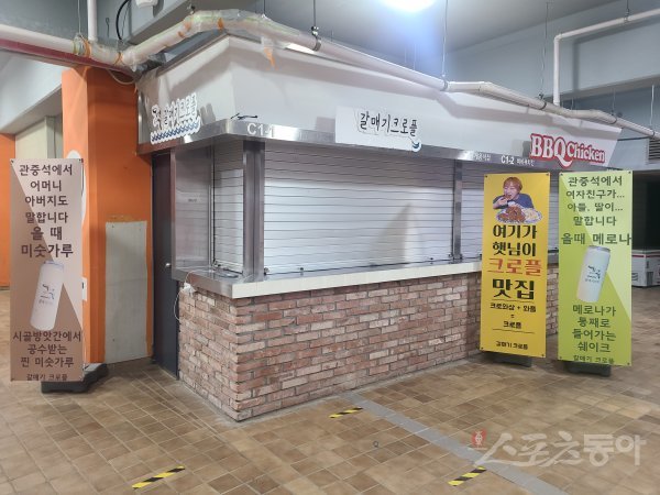 부산 사직야구장 내 입점한 식음료 업체 대부분이 문을 닫았다. 경기가 한창인 시각 굳게 닫힌 문은 코로나19 시국의 엄중함을 드러낸다. 사직 | 최익래 기자