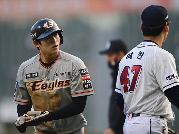 2회초 1사 1루 한화의 우전 안타 때 1루주자 조한민이 2루를 지나 3루로 파고들었지만 아웃된 뒤 아쉬워하고 있다.