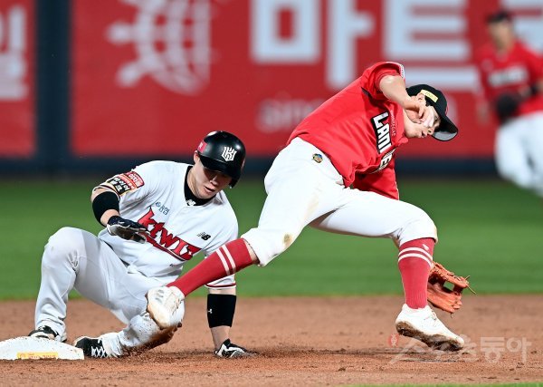 5회말 무사 1루에서 kt 1루 주자 이홍구가 동료의 희생번트 때 SSG 송구 실책으로 2루까지 진루하고 있다.