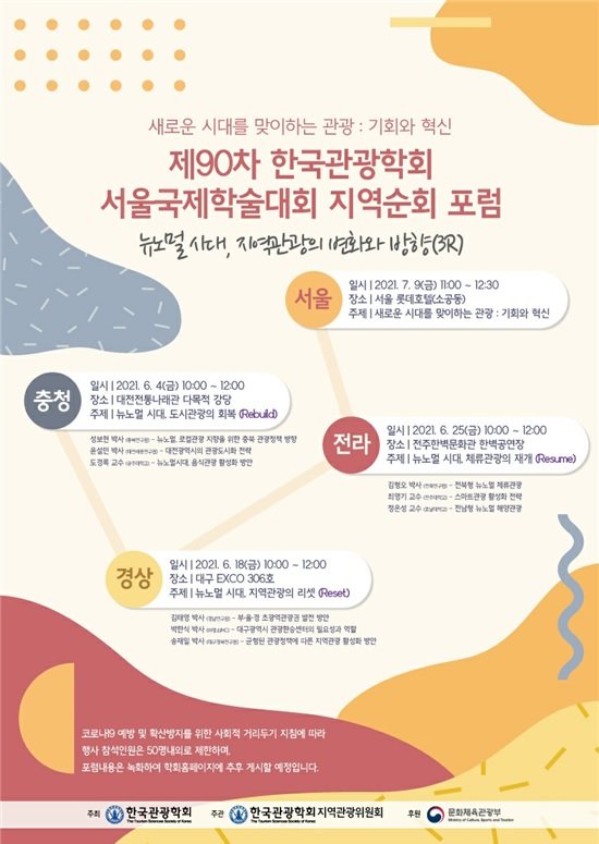 한국관광학회는 코로나19 이후의 관광산업이 맞이할 변화와 이에 대한 업계 혁신을 소재로 한 지역순회 포럼과 국제학술대회를 개최한다. 7월7일부터 9일까지는 서울국제학술대회
