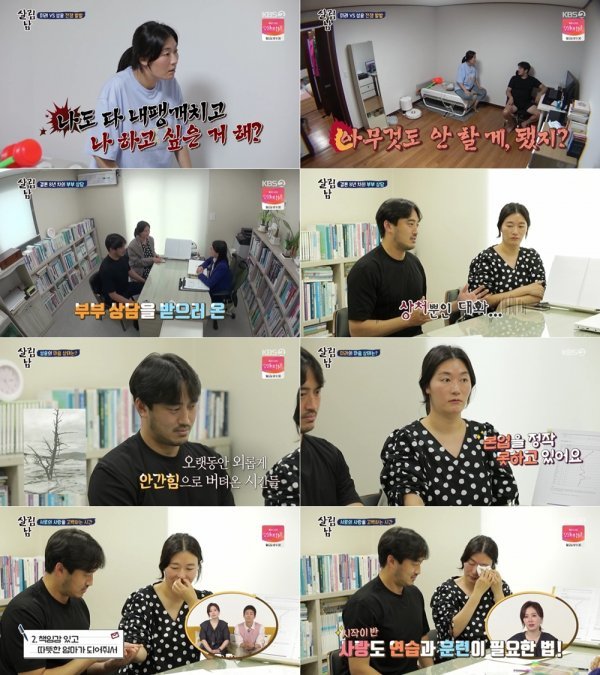 이날 방송에서는 김미려, 정성윤 부부가 상담을 받는 이야기가 그려졌다. 두 아이의 엄마인 동시에 집안의 가장으로 바쁘게 일하는 워킹맘 미려는 최근 들어 살림과 육아에 소홀한 성윤의 모습에 화가 났다. 육아를 전담해야 하는 성윤은 연기에 대한 감이 떨어질 것 같은 불안한 마음에 직접 쓴 시나리오로 연기를 하기 위해 글 쓰는 작업을 시작했던 것.