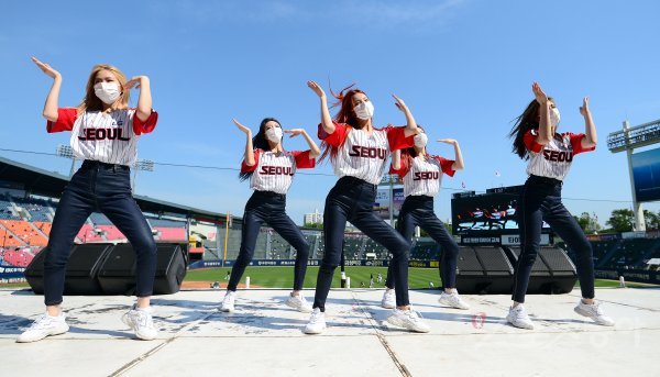 30일 서울 잠실야구장에서 ‘2021 신한은행 SOL KBO리그’ 키움 히어로즈와 LG 트윈스 경기가 열렸다. 걸그룹 ‘ITZY(있지)’가 클리닝타임 때 공연을 펼치고 있다.
