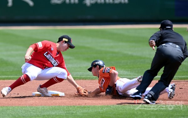 30일 대전 한화생명이글스파크에서 ‘2021 신한은행 SOL KBO리그’ 한화 이글스와 SSG 랜더스의 경기가 열렸다. 1회말 무사 1루에서 한화 1루 주자 정은원이 폭투 때 2루를 노렸으나 SSG 박성한에게 태그 아웃되고 있다.