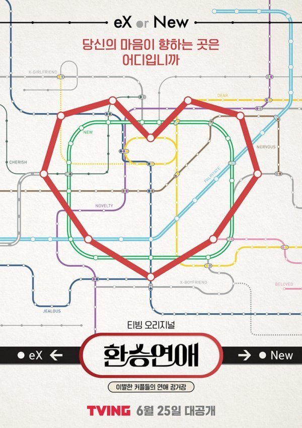 또 \'X-GIRLFRIEND\', \'X-BOYFRIEND\'란 단어와 더불어 \'JEALOUS\', \'PALPITATE\', \'NERVOUS\', \'NOVELTY\', \'CHERISH\' 등 다양한 감정의 단어들이 각각의 노선 이름으로 명명돼 있고 얽히고 설켜있는 노선들을 하나 하나 지나다 보면 어느새 선명한 하트가 완성돼 있다. 다양한 감정의 찰나들을 보낸 뒤 비로소 마음이 향하는 곳을 찾에 될 \'환승연애\'만의 색다른 사랑의 여정길이 궁금해진다.
