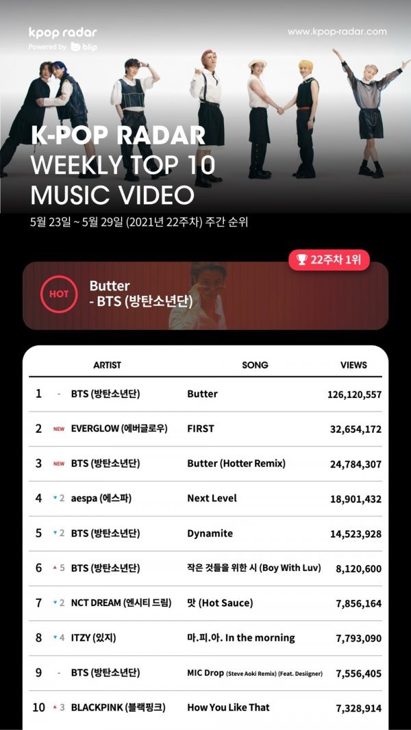 지난 21일 공개된 방탄소년단의 ‘Butter(버터)’ 뮤직비디오는 케이팝 레이더 22주차 집계 기간 (5월 23일 ~ 5월 29일)동안 약 1억 2600만 뷰를 기록하며 다시 한 번 정상에 올랐다.