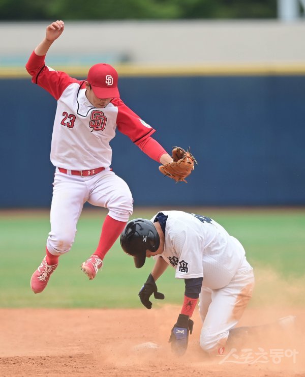 1일 서울 목동야구장에서 ‘제75회 황금사자기 전국고교야구대회 겸 주말리그 왕중왕전’ 강릉고와 서울 디자인고의 경기가 열렸다. 7회말 1사 1, 3루 상황에서 디자인고 유격수양민수가 강릉고 1루주자 김세민에게 도루를 허용하고 있다.