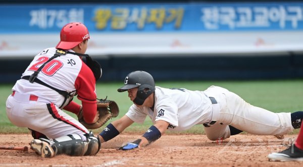 1일 서울 목동야구장에서 ‘제75회 황금사자기 전국고교야구대회 겸 주말리그 왕중왕전’ 강릉고와 서울 디자인고의 경기가 열렸다. 6회말 1사 3루 강릉고의 스퀴즈 번트 때 3루주자 차동영이 홈으로 파고들었지만 디자인고 포수 신준우에게 태그 아웃되고 있다.