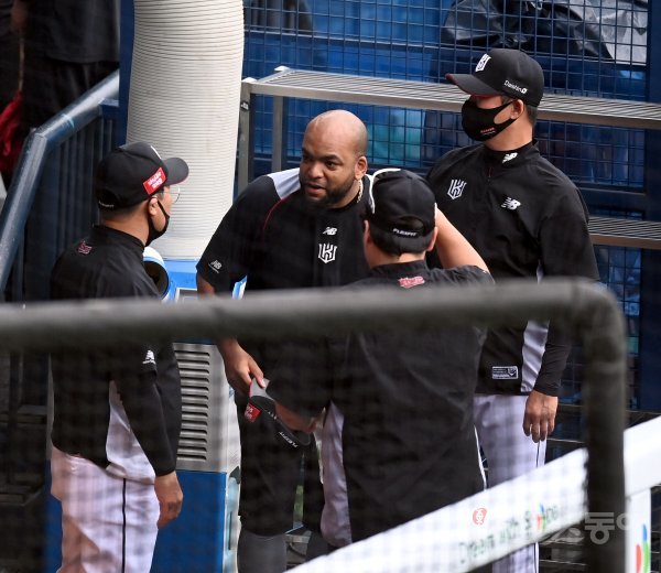 1일 서울 잠실야구장에서 ‘2021 신한은행 SOL KBO리그’ KT 위즈와 LG 트윈스 경기가 열린다. KT 데스파이네가 코치에게 인사하고 있다.