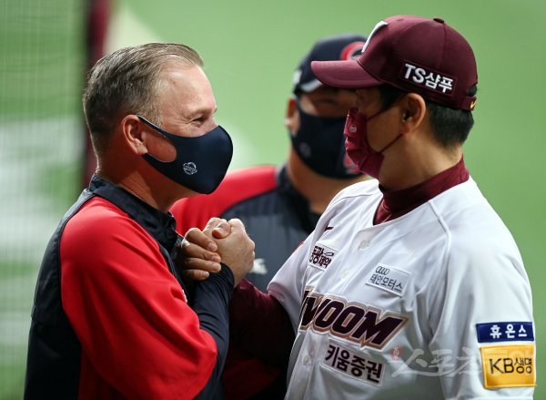 경기 전 롯데 서튼 감독과 키움 홍원기 감독이 만나 인사를 나누고 있다.