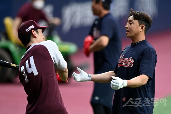 경기 전 키움 서건창과 롯데 손아섭이 만나 이야기를 나누고 있다.