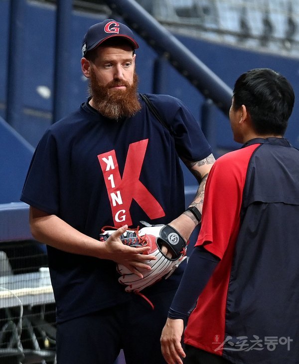 경기 전 롯데 스트레일리가 ‘KING’이 새겨진 유니폼을 입고 있다.