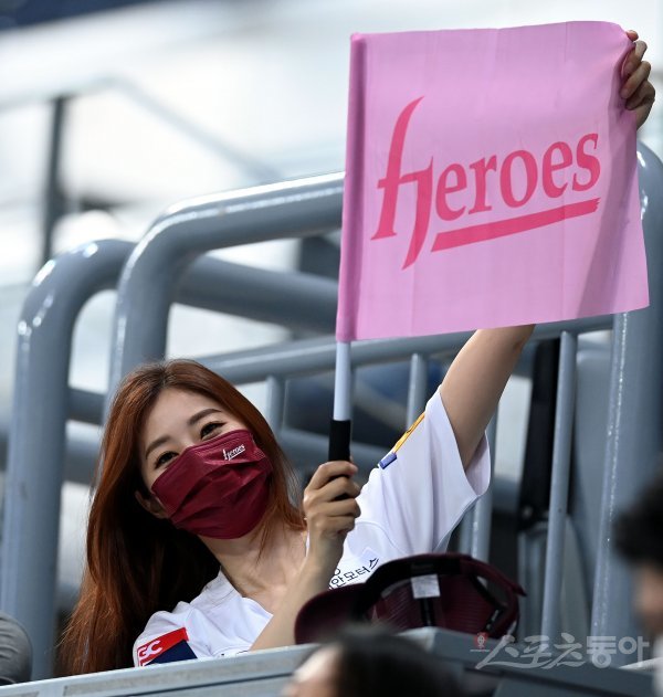 시구를 던진 방송인 서동주가 관중석에서 키움을 응원하고 있다.