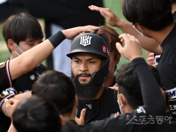 1회초 2사 2루 KT 알몬테가 좌중월 투런 홈런을 날리고 그라운드를 돌아 홈인해 동료들의 축하를 받고 있다.