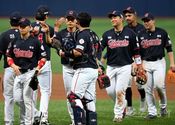 롯데가 키움에 3-0으로 승리한 뒤 선수들이 그라운드에서 기쁨을 나누고 있다.