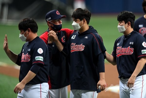 롯데가 키움에 3-0으로 승리한 뒤 승리투수 나균안이 서튼 감독의 환영을 받고 있다.