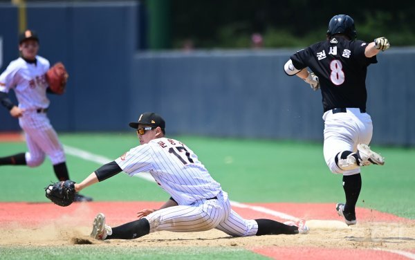 2일 서울 신월야구장에서 ‘제75회 황금사자기 전국고교야구대회 겸 주말리그 왕중왕전’ 장충고와 광주진흥고의 경기가 열렸다. 9회말 무사 상황에서 장충고의 내야 땅볼 때 진흥고 1루수 문동주가 1루에서 타자 주자를 아웃시키고 있다.