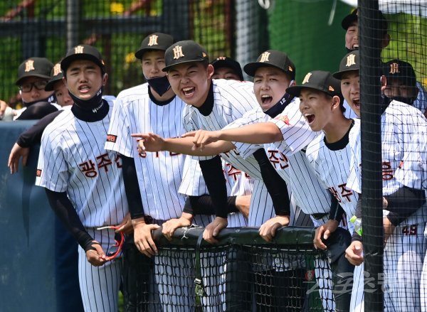 2일 서울 신월야구장에서 ‘제75회 황금사자기 전국고교야구대회 겸 주말리그 왕중왕전’ 장충고와 광주진흥고의 경기가 열렸다. 9회말 2사 상황에서 광주진흥고 선수들이 더그아웃에서 응원을 하고 있다.