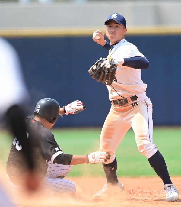 2일 서울 목동야구장에서 ‘제75회 황금사자기 전국고교야구대회 겸 주말리그 왕중왕전’ 유신고와 K-POP고의 경기가 열렸다. 5회초 무사 1루 K-POP고의 내야 땅볼 때 유신고 유격수 정원영이 1루주자를 포스 아웃시킨 뒤 1루로 송구하고 있다.