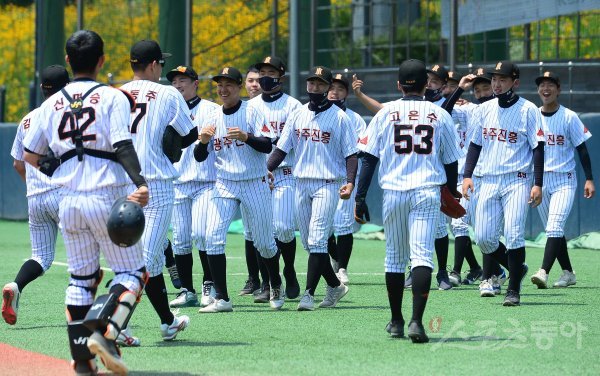 2일 서울 신월야구장에서 ‘제75회 황금사자기 전국고교야구대회 겸 주말리그 왕중왕전’ 장충고와 광주진흥고의 경기가 열렸다. 광주진흥고가 장충고에 4-2로 승리를 거둔 뒤 선수들이 기쁨을 나누고 있다.