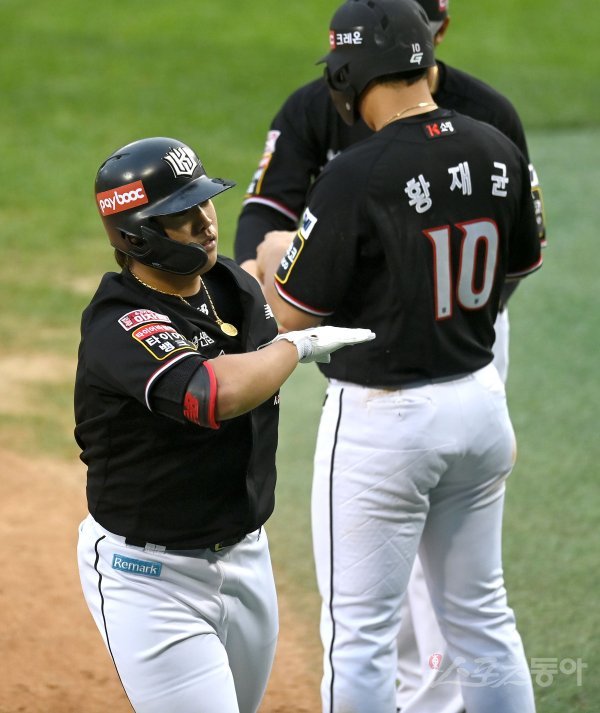3회초 무사 1루 KT 강백호가 역전 투런 홈런을 날리고 그라운드를 돌아 홈인해 하이파이브 하고 있다.